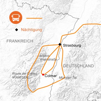 Das Elsass, eine historische, traditionsreiche Region im Nordosten Frankreichs, liegt in der Rheinebene und grenzt an Deutschland und die Schweiz. Jahrhundertealte Fachwerkhäuser mit Storchennestern auf den Dächern, Flüsse mit steinernen Brücken, imposante Burgen und Schlösser und einladende Weinlandschaften prägen die Gegend um Straßburg, Colmar und Mulhouse. Besuchen Sie mit uns die schönsten Ecken und entdecken Sie die Sehenswürdigkeiten und Gaumenfreuden im Elsass!