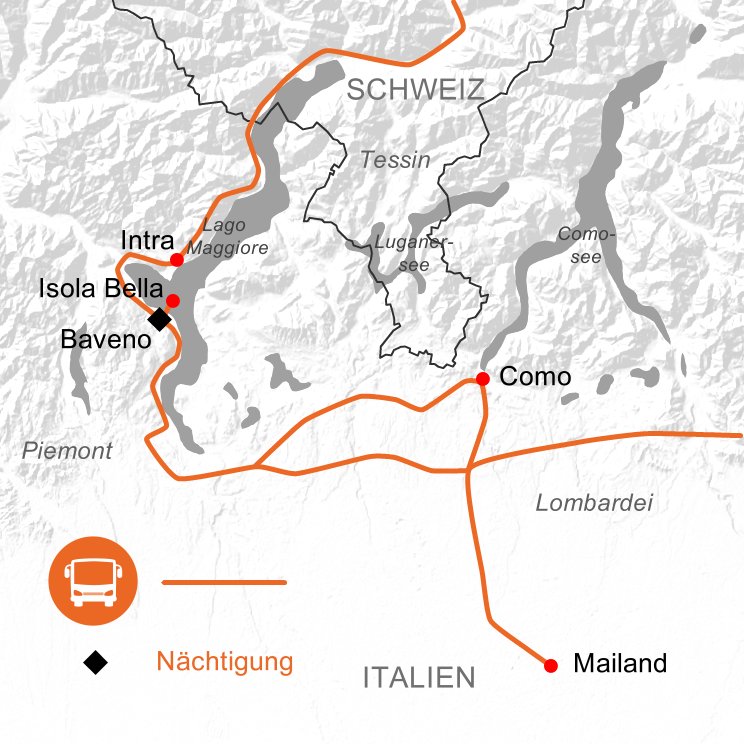 Der Lago Maggiore, ein wunderschöner See am südlichen Rand der Alpen, ist der zweitgrößte See Italiens und erstreckt sich über die Regionen Piemont, Lombardei und das Schweizer Tessin. An der Westküste liegt der beschauliche Ort Baveno, mit seiner malerischen Seepromenade und den vorgelagerten Borromäischen Inseln. Dazu zählt auch die Isola Bella ("schöne Insel"), auf der ein imposanter Palast und ein terrassierter Garten zu einem Rundgang einladen. Ein Ausflug in die Mode- und Kulturmetropole Mailand und nach Como runden unsere Reise ab.