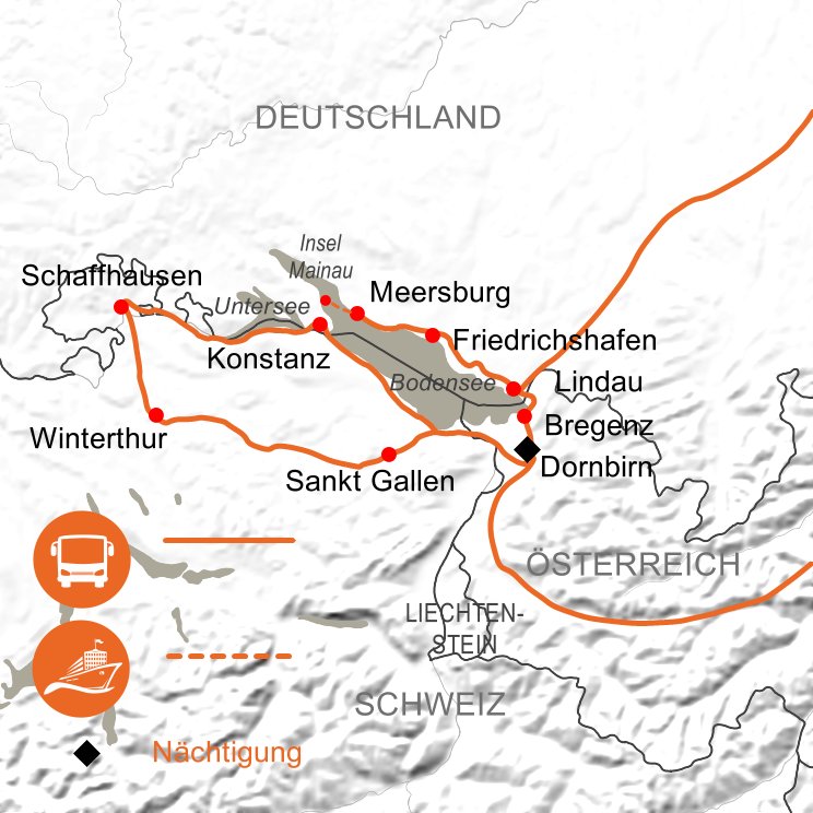 Heute widmen wir uns der Schweizer Seite des Bodensees. Zunächst geht es über St. Gallen zum Rheinfall nach Schaffhausen. Der Wasserfall zählt mit seinen 23 m Höhe und 150 m Breite zu den größten und wasserreichsten Wasserfällen Europas. Nur wenige Kilometer vom Bodensee entfernt, gehört der Rheinfall außerdem zu den beeindruckendsten Naturereignissen dieser Gegend. Im Anschluss fahren wir entlang des Rheins nach Stein am Rhein und auf der Panoramastraße, am Seeufer entlang, kommen wir schließlich nach Konstanz. Unser örtlicher Reiseleiter erklärt uns auf unserem Rundgang durch die historische Altstadt die einzigartige Geschichte der größten Stadt am Bodensee. Rückfahrt zum Hotel und Abendessen in einem Restaurant (nicht im Reisepreis inkludiert).