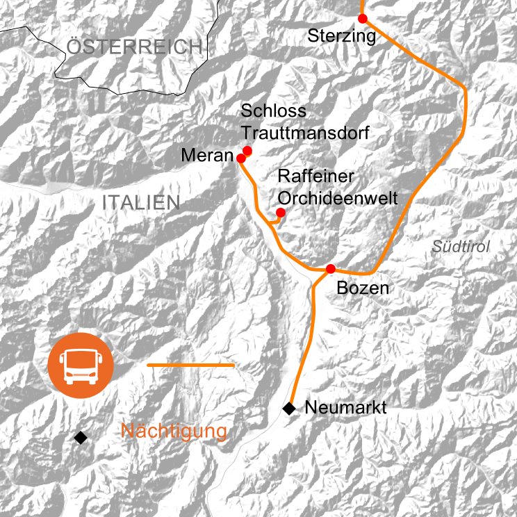 Südtirols Pflanzenwelt ist vielfältig und artenreich. Durch die Lage an der Alpensüdseite ist die Region vor kalten Winden und niedrigen Temperaturen geschützt. So sind hier sowohl hochalpine als auch submediterrane Pfanzen heimisch, was sich im kunstvoll angelegten Garten von Schloss Trauttmansdorff zeigt. Mit fast 300 Sonnentagen im Jahr gedeihen in Südtirol auch Orchideen besonders gut. In der Raffeiner Orchideenwelt gibt es etwa 300 unterschiedliche Orchideenarten zu bestaunen. Bei geführten Rundgängen lernen wir außerdem die wichtigsten Sehenswürdigkeiten der Städte Meran und Bozen kennen.