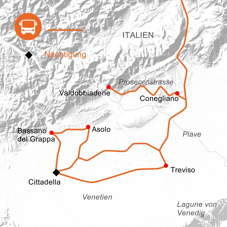 Unsere Reise führt uns heute nach Treviso. Die Stadt wird aufgrund seiner verzweigten Wasserläufe auch liebevoll "Klein-Venedig" genannt. Wir sehen bei einem geführten Rundgang die wichtigsten Sehenswürdigkeiten, wie die historisch bedeutende Franziskanerkirche, den malerischen Buranellikanal, sowie den lebhaften Fischmarkt und erfahren die Geschichte des weltbekannten Desserts: das Tiramisu, welches seinen Ursprung in Treviso hat. Als nächstes widmen wir uns der Proseccostraße, die seit 2019 UNESCO-Weltkulturerbe ist, und erkunden die Heimat des schmackhaften Perlweins. Die erste Weinstraße Italiens beginnt in Conegliano und windet sich zwischen sanften Hügeln in der Gegend um Feletto, dem Piave und Valdobbiadene, die mit üppigen Weinbergen bedeckt sind. Beim Besuch einer Kellerei bekommen wir einen Eindruck, mit wie viel Liebe und Leidenschaft die Winzer ihre Trauben verarbeiten. Im Anschluss können wir den prickelnden Perlwein verkosten. Zum Abendessen werden wir in einem Agriturismo (italienischer Bauernhof) einkehren, wo uns verschiedene lokale Köstlichkeiten erwarten.