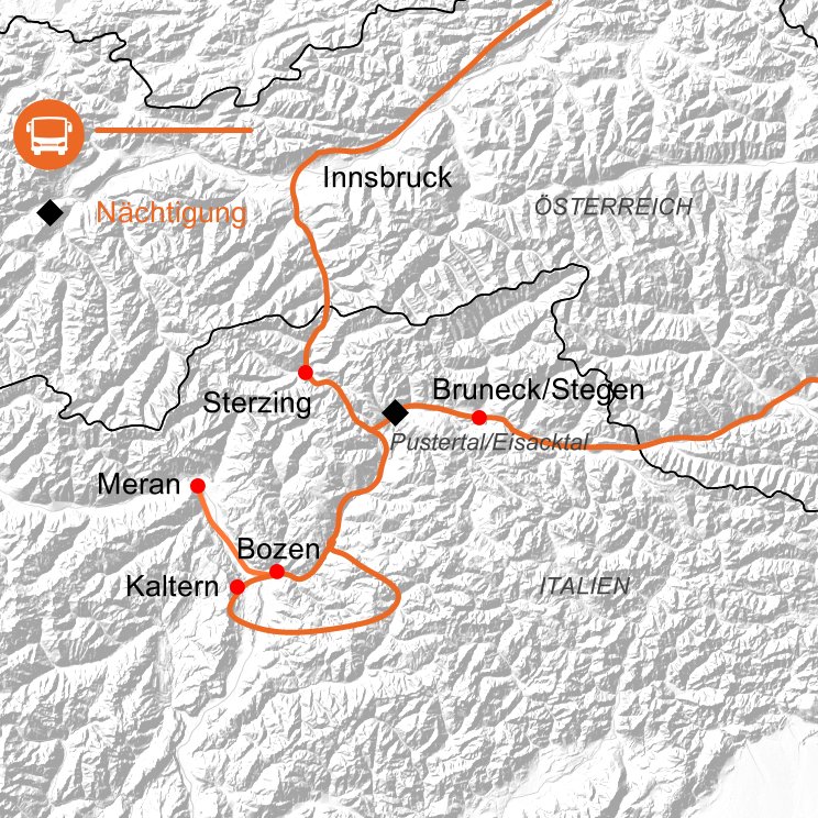 Unsere Anreise führt uns über Salzburg nach Brixen. Vor Ort Zeit zur freien Verfügung. Spazieren Sie zum Brixner Dom, dem Kreuzgang und zur Hofburg oder machen Sie einen Einkaufsbummel durch die mittelalterlichen Gassen der Altstadt, wo sich viele Geschäfte aneinanderreihen. Am Nachmittag fahren wir weiter zu unserem Hotel im Puster- oder Eisacktal. Abendessen im Hotel.