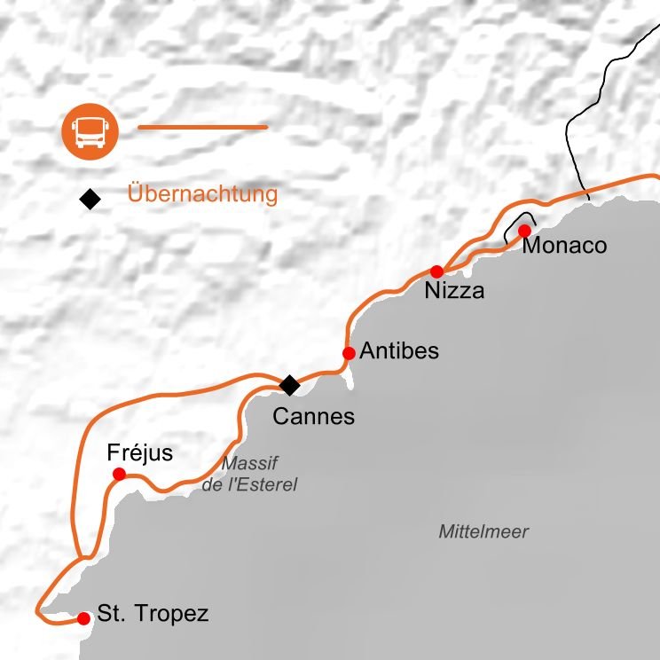 Unser Ausflug führt uns heute zur Corniche d'Or, eine der schönsten Küstenstraßen der Côte d'Azur, welche sich zwischem dem Esterel Gebirge und dem Mittelmeer befindet. Wir genießen einen traumhaften Ausblick auf das türkisblaue Mittelmeer, grüne Vegetation und den roten Felsmassiven des Esterel, bevor wir Saint-Tropez, die "Stadt der Reichen und Schönen" erreichen. Bekannt ist Saint-Tropez vor allem für Glanz und Glamour, pompöse Yachten und teure Sportwägen. In Port Grimaud erwartet uns eine einzigartige Lagunenstadt, nicht umsonst wird der farbenfrohe Hafen auch als "französisches Venedig" bezeichnet. Am Abend kommen wir wieder zurück ins Hotel.