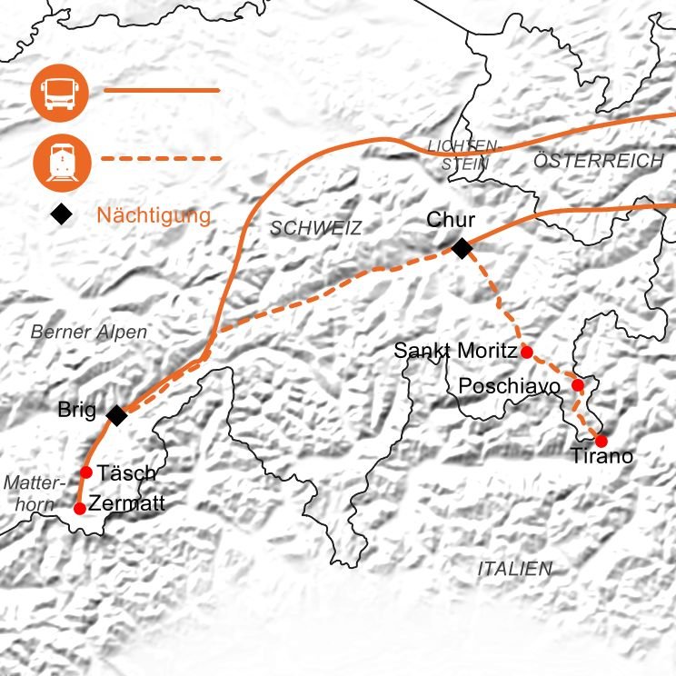 Nach einer wunderschönen Anreise über Samnaun und den Flüelapass nächtigen wir in Chur. Von dort fahren wir mit dem Bernina Express nach Tirano (Italien) und dem Glacier Express nach Brig. Ein Tagesausflug führt uns nach Zermatt, wo wir das Matterhorn sehen und auf den 3.130 m hohen Gornergrat mit einer Zahnradbahn fahren können. Die Heimreise führt über den Furkapass und den Zürich- und Walensee. Entdecken Sie die Schweizer Naturschönheiten bei einer Kombination aus Bus und Bahn!