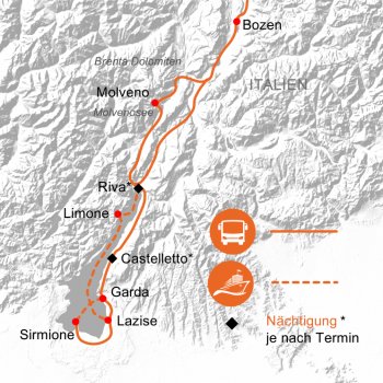 Fahrt über Innsbruck und den Brenner nach Südtirol. Vorbei an Brixen, Bozen und den Brenta Dolomiten gelangen wir zum Molvenosee. Weiterfahrt an den Gardasee, wo wir unser Hotel beziehen.