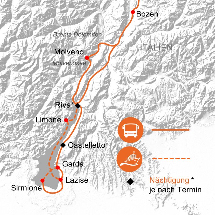 Eingebettet zwischen den Alpen und dem Flachland der Po-Ebene liegt der Gardasee. Das milde Klima, die üppige Vegetation im reizenden Hinterland und die pittoresken, kleinen Ortschaften machen den größten See Italiens zu einer beliebten, ganzjährigen Urlaubsregion. Genießen Sie mit uns "La Dolce Vita" unter der italienischen Sonne vor dem Panorama des Monte Baldo.