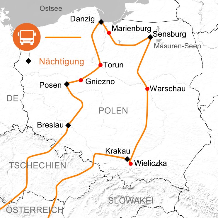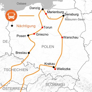 Entdecken Sie mit uns während unserer Rundreise durch Polen die Hauptstadt Warschau, die Großstädte Krakau, Breslau, Posen und Danzig sowie eine abwechslungsreiche Fülle von Sehenswürdigkeiten und Naturlandschaften!