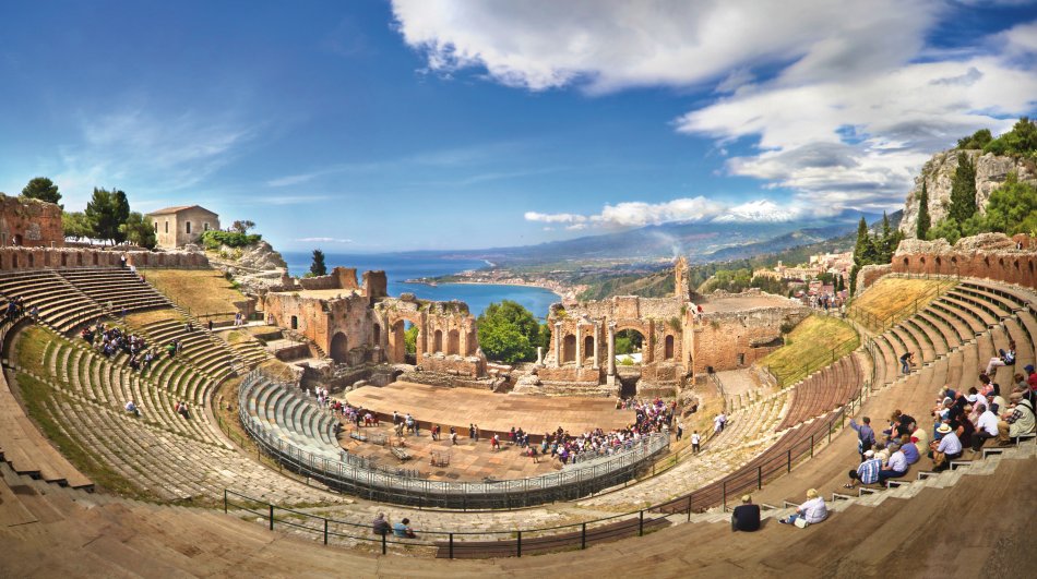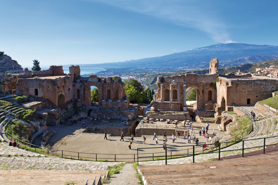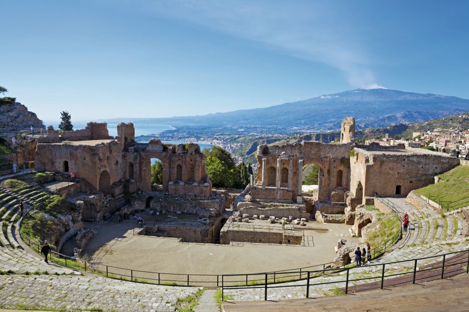 Vor der atemberaubenden Kulisse des Ätna erkunden Sie die antiken Stätten Siziliens. Griechen, Römer und Normannen - alle haben ihre sichtbaren Spuren auf der größten Insel des Mittelmeeres hinterlassen. Die barocken Prachtbauten in Syrakus, das Tal der Tempel bei Agrigent und die Goldmosaike im Dom von Monreale machen die Insel zu einer Schatzkammer der Geschichte.