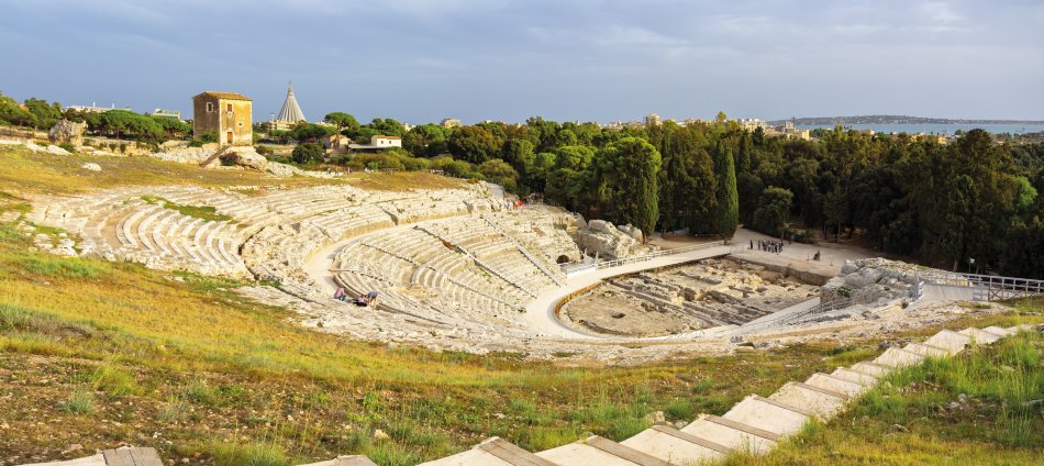 Nach dem Frühstück führt Sie Ihre Sizilien Rundreise nach Syrakus, eine der bedeutendsten Städte der griechischen Antike. Sie erkunden zunächst die Archäologische Zone (Eintritt nicht inkludiert) mit dem griechischen Theater und dem Ohr des Dionysios, eine in Fels gehauene Höhle mit bemerkenswerter Akustik. Anschließend spazieren Sie durch die verwinkelte Altstadt auf der Insel Ortygia. Nächtigung in Syrakus.