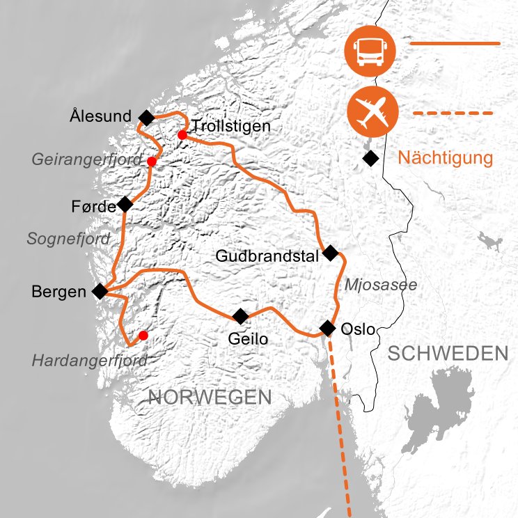 Lassen Sie sich verzaubern von unberührten Landschaften, bezaubernden Städten, gewaltigen Bergen und imposanten Fjorden. Besuchen Sie den „König der Fjorde“, den Sognefjord, und den größten Gletscher des europäischen Festlandes, den Jostedalsbreen. Unternehmen Sie eine Fahrt mit der spektakulären Flåmbahn, der berühmtesten Bahnstrecke Skandinaviens, genießen Sie das großartige Panorama des Geirangerfjordes und erleben Sie die vielen Facetten Fjordnorwegens!