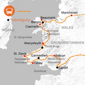 Entdecken Sie die vielfältige Schönheit von Wales – von imposanten Burgen und grünen Nationalparks, bis hin zu verträumten Küstenorten. Diese Reise führt Sie durch beeindruckende Landschaften wie den Snowdonia-Nationalpark, auf die geschichtsträchtige Insel Anglesey und bis in die lebendige Hauptstadt Cardiff. Kulturelle Höhepunkte, malerische Dörfer und faszinierende Einblicke in die walisische Geschichte und Lebensart machen diese Reise zu einem ebenso abwechslungsreichen, wie bereichernden Erlebnis.