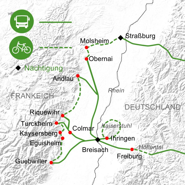 Im schönen Elsass und Breisgau erwartet uns eine Mischung aus Kultur und Genuss. Bei ausgedehnten Radtouren radeln wir auf gut ausgebauten Radwegen durch Weinberge und malerische Dörfer. Außerdem durchfahren wir die Ausläufer des Schwarzwaldes mit Freiburg. Highlights sind die Städte Colmar und Straßburg sowie die lokale Küche, die wir bei einem traditionellen Flammkuchenessen und einer Weinverkostung kennenlernen!