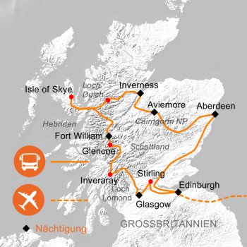 Getränke und zusätzliche Mahlzeiten, persönliche Ausgaben, Trinkgelder, Eintrittspaket (Inveraray Castle, Urquhart Castle, Fort George, Whiskyverkostung, Edinburgh Castle, Linlithgow Palace, Stirling Castle) € 98,-, sonstige Eintritte, Reise- & Stornoversicherung